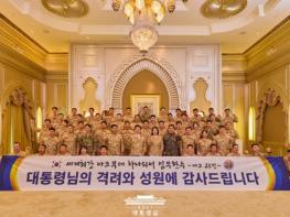 아랍에미리트연합(UAE)를 국빈 방문 중인 이재명 대통령 부부는 19일(현지시간) 아크부대의 부대원 50명을 아부다비로 초청해 격려했다. 이 대통령이 외국 현지에서 우리 파병부대를 격려하는 것은 이번 행