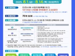 인천광역시는 최근 경기 침체로 어려움을 겪는 소상공인들의 경영 안정화를 도모하기 위해 ‘2025년 2차 소상공인 경영환경개선 지원사업’참여업체를 8월 1일부터 8월 14일까지 모집한다고 밝혔다.경영환경