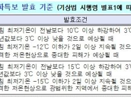 해양수산부는 12월 31일 15시부로 저수온 위기경보* ‘주의’ 단계를 발령했다고 밝혔다. 국립수산과학원이 수온 하강이 예상되는 서해와 남해 연안(내만 포함)에 저수온 예비주의보를 발표(12. 31. 14시)