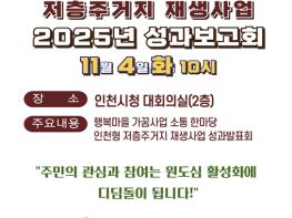 인천광역시는 11월 4일 인천시청 대회의실에서 ‘2025년 인천형 저층주거지 재생사업 성과보고회’를 개최한다고 밝혔다.이번 행사는 그동안 추진해 온 재생사업의 성과를 시민과 공유하고, 향후 주민공동이