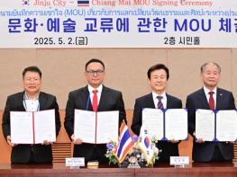 진주시는 2일 태국 치앙마이주 국제교류단과 지역 축제 협력 강화를 위한 국제 문화·예술 교류에 관한 양해각서(MOU)를 체결했다고 밝혔다.태국 치앙마이주 주정부 관선 부지사, 지방행정부 부의장(민선 부