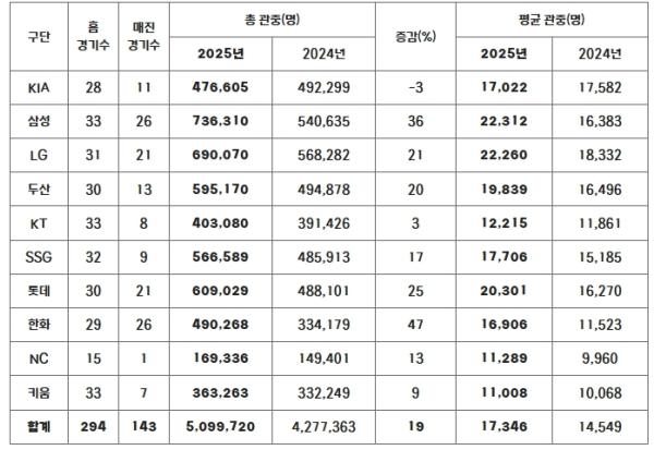 구단 별 총 관중 수에서는 삼성이 홈 33경기를 치르는 동안 73만 6,310명이 구장을 찾아 가장 먼저 70만 관중을 돌파했다. 삼성에 이어 LG 69만 70명, 롯데 60만 9,029명으로 60만 관중을 넘겼다. 또한 두산 59만 5,170명, SSG 56만 6,589명을 기록하며, 10개 구단 중 5개 구단이 전체 홈 경기 일정의 절반을 치르지 않은 시점에서 55만 관중을 넘어섰다.