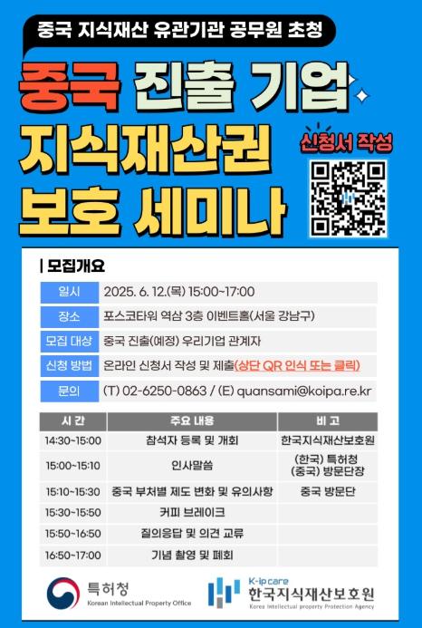 한편, 중국 진출(예정)기업 지재권 보호 세미나 참여를 희망하는 기업은 온라인으로 참가 신청이 가능하다.