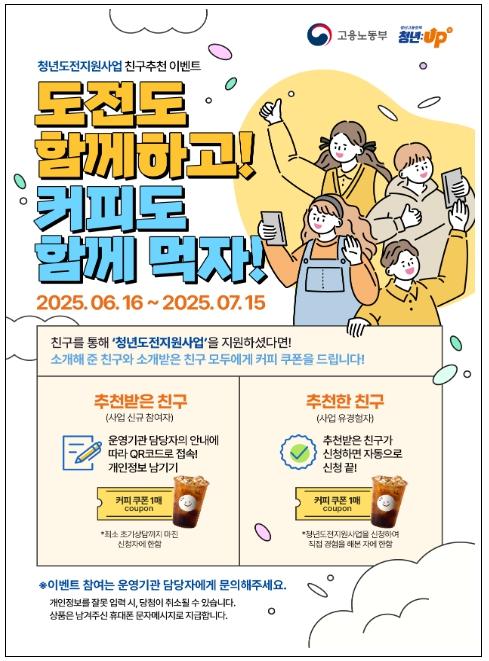 고용노동부는 장기 실업 등으로 인해 자신감이 저하된 청년들을 더 가까이 발굴·지원하기 위해 1달간(6.16.~7.15.) ‘또래 추천 이벤트’를 실시한다. 주변 친구의 도움을 받아 청년도전지원사업에 참여(초기상담)한 청년과 추천한 청년 모두에게 커피 쿠폰을 지급하는 방식으로 진행된다.