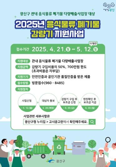 광주 광산구는 다량배출사업장을 대상으로 음식물쓰레기 감량기 설치 지원사업을 시행한다고 밝혔다.