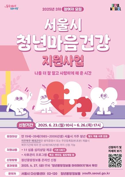 청년의 아픈 마음을 보듬고, 변화와 성장을 준비할 수 있도록 마음 역량을 길러주는 ‘서울 청년 마음건강 지원사업’이 올해 3차 참여자를 모집한다.