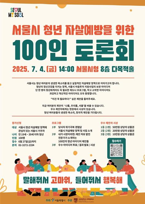 서울시가 청년의 자살 문제에 대한 해법을 찾기 위해, 오는 7월 4일 오후 2시 서울시청 8층 다목적홀에서 ‘청년 자살예방 100인 토론회’를 연다. 이번 행사는 청년이 스스로 정책을 제안하고 토론하며, 현장에서 직접 우수 정책을 선정하는 시민참여형 정책 토론회다.