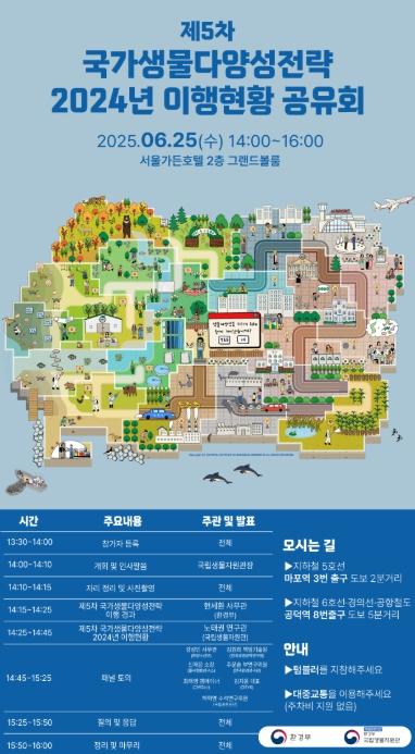 이번 공유회는 ‘제5차 국가생물다양성전략’ 이행 첫해의 구체적 실적과 현황을 공유하여 부처 간 협력 및 시민사회의 참여 기회를 확대하는 데 목적을 두고 있다. 이를 위해 2024년 이행 실적은 물론 이에 대한 이행평가단의 검토 의견이 함께 공개된다.