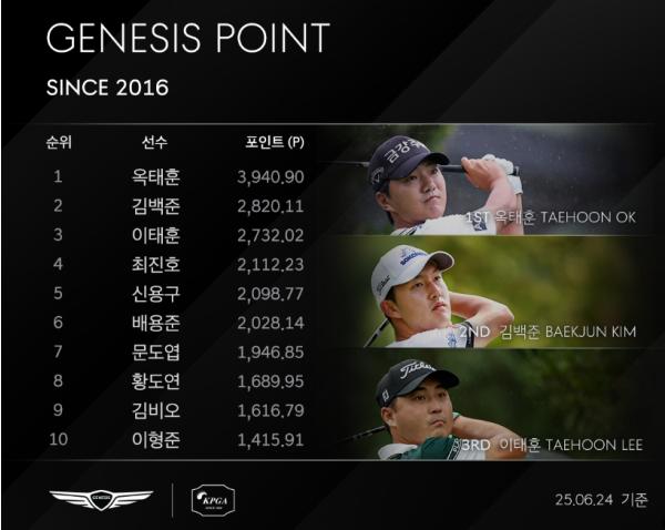 2018년 KPGA 투어에 데뷔한 옥태훈의 제네시스 포인트 최고 순위는 2024 시즌 기록한 7위다. 옥태훈은 지난해 생애 처음으로 제네시스 포인트 TOP10에 진입하는 데 성공했다.