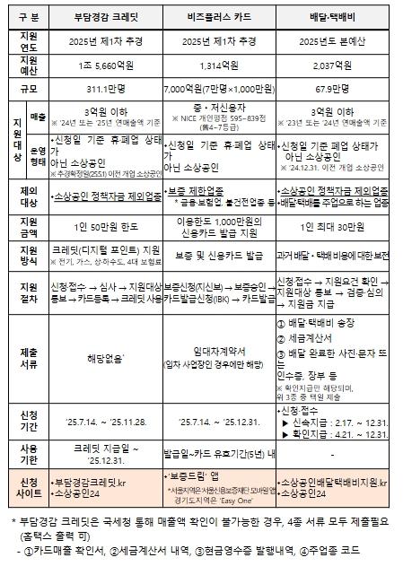 새롭게 시작하는 두 사업은 2025년 제1차 추가경정예산을 통해 ▲부담경감 크레딧 1조 5,660억원, ▲비즈플러스카드 7,000억원 규모로 지원될 예정이며, 7월 14일부터 신청·접수를 시작할 계획이다.