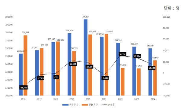 2023년 한 해 동안 서울에서 타 지역으로 나간 청년 약 23.5만 명은 가족(8.2만 명, 34.9%)·직업(6.7만 명)·주택(4.9만 명) 등을 이유로 전출, 타 지역에서 서울로 들어온 청년 약 26.2만 명은 직업(12.2만 명, 46.4%)·가족(4.9만 명)·교육(4만 명) 등 이유로 전입한 것으로 나타났다.