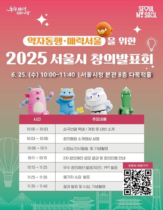 서울시는 6월 25일 서울시청 다목적홀(8층)에서 시민‧전문가 평가단, 공무원 등 300여 명이 참석한 가운데'2025년 2차 창의 발표회'를 개최한다.