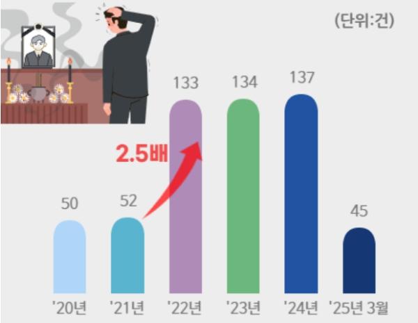 이는 코로나 기간(2020~2021)중에는 사회적 거리두기 시행 등으로 장례식이 상당 부분 축소·취소되어, 이에 따른 민원 신청 건수도 적은 것으로 보여지며, 2022년 이후부터는 연 130건 정도의 민원이 발생했다.