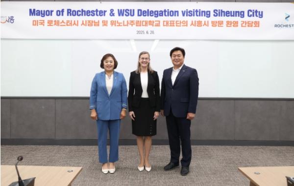 시흥시는 미국 미네소타주 로체스터시의 킴 노튼(Kim Norton) 시장과 위노나주립대학교(Winona State University) 대표단이 26일 시흥시청 글로벌센터에서 자매결연도시 교류 간담회를 열었다고 밝혔다.