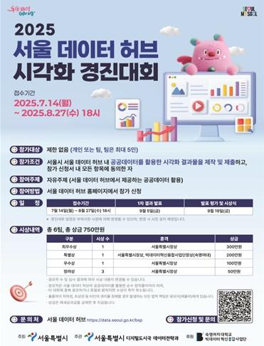 서울시는 공공데이터 활용 저변 확대와 시민 참여 활성화를 위해 오는 9월 19일 ‘서울 데이터 허브’의 공공데이터와 서비스를 이용한 첫 시각화 경진대회인'2025 서울 데이터 허브 시각화 경진대회'를 개최한다고 밝혔다.