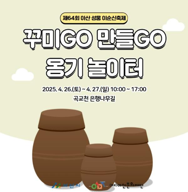 본 행사는 오는 4월 26일부터 27일까지 이틀간, 아산 곡교천 일대에서 ‘꾸미GO 만들GO 옹기놀이터’ 공예 체험 프로그램을 운영한다.