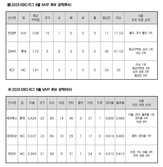 2025 신한 SOL뱅크 KBO 리그 6월 월간 MVP 후보로 총 6명의 선수가 선정됐다. 투수 중에서는 KIA 전상현, 롯데 감보아, NC 로건, 야수 중에는 롯데 레이예스, NC 데이비슨, 박민우가 6월 월간 MVP 수상을 노린다.