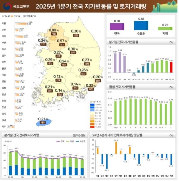 국토교통부와 한국부동산원(원장 손태락)은 ’25년 1분기 지가변동률 및 토지거래량을 발표했다.