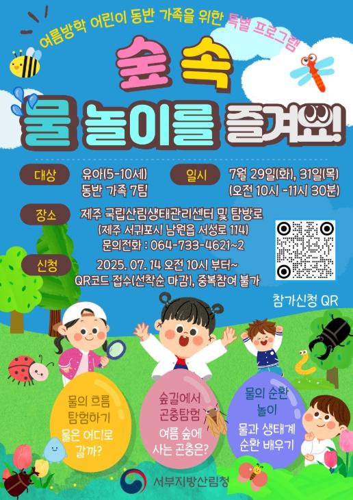 이번 행사는 '숲 속 물놀이를 즐겨요'를 주제로 물의 흐름 탐험, 산림생태계 순환 배우기, 여름 제주 숲에 사는 곤충 관찰 등의 생태프로그램(90분)과 사진 및 종자 전시 등을 통해 제주 지역의 산림유전자원을 더욱 생생하게 전달하고자 한다.