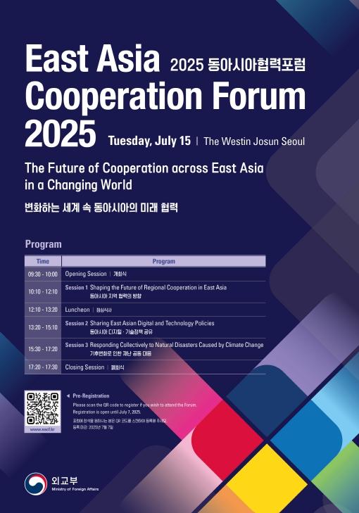 외교부는 “변화하는 세계 속 동아시아의 미래 협력”을 주제로 한 '2025 동아시아협력포럼'을 7월 15일 서울(웨스틴조선)에서 개최한다.