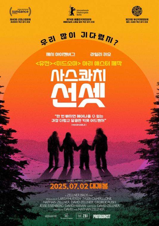 '유전''미드소마' 아리 애스터 감독이 총괄 프로듀서로 참여했으며, 선댄스, 베를린, SXSW, 부산을 발칵 뒤집은 귀여운 문제작 '사스콰치 선셋'이 7월 16일(수) 바로 오늘부터 극장 동시 IPTV & VOD 서비스를 시작한다.[감독: 데이비드 젤너, 나단 젤너 | 제작: 아리 애스터 | 출연: 제시 아이젠버그, 라일리 키오, 나단 젤너, 크리스토프 자야츠 데넥 | 장르: 코미디, 어드벤처 | 수입/배급: ㈜스튜디오 디에이치엘]