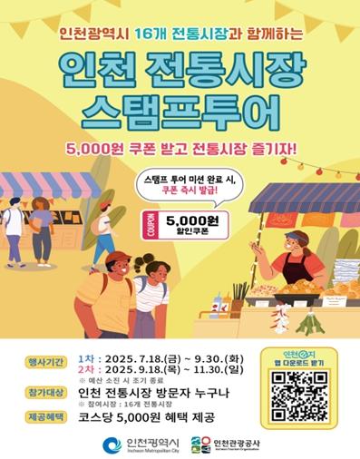 인천광역시와 인천관광공사는 전통시장의 매력을 널리 알리고 지역 경제 활성화를 도모하기 위해 ‘매력으뜸 전통시장 육성사업’의 일환으로 오는 7월 18일부터 11월 30일까지 두 차례에 걸쳐 ‘전통시장 모바일 스탬프투어’를 개최한다고 밝혔다.