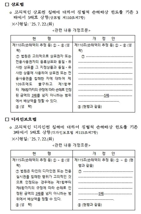 이번 개정은 지난해 특허법과 부정경쟁방지법에 도입(’24.8.21)된 특허·영업비밀 침해 및 아이디어 탈취행위에 대한 최대 5배 징벌적 손해배상제도를 상표와 디자인 분야까지 확대하는 것이다. 이로써, 우리나라는 고의적인 지식재산(저작권 제외) 침해에 대해 세계에서 가장 높은 수준인 최대 5배 징벌배상을 부과할 수 있는 체계를 구축하게 됐다.