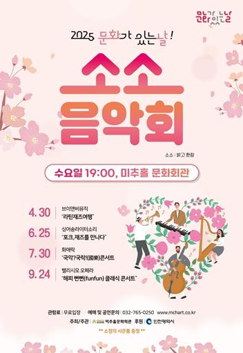 ‘소소 음악회’는 인천 시민 누구나 무료로 관람할 수 있으며, 자세한 내용은 미추홀문화회관 누리집에서 확인할 수 있다.