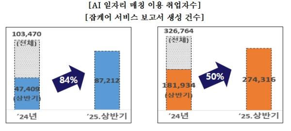 이와 함께 진로탐색, 직업선택, 취업준비를 지원하는 ‘잡케어 서비스’도 이용자가 크게 늘었다. 잡케어는 구직자의 이력서‧자기소개서 등을 AI가 분석해 진로 로드맵, 적합직무, 훈련추천 등을 제공하는 진로상담 도우미로, 특히 청년층의 호응이 컸다. 올해 상반기 잡케어 보고서 생성 건수는 274,316건으로 지난해 같은 기간(181,934건) 대비 50% 증가했으며, 20대 이하 이용자가 90%에 달하는 것으로 나타났다.