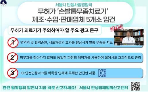 서울시 민생사법경찰국은 가정용 셀프케어 제품으로 최근 수요가 급증한 ‘레이저 손발톱무좀치료기’를 집중 단속한 결과 식품의약품안전처의 의료기기 허가 없이 불법 제조·판매한 업체 5개소를 입건했다고 밝혔다.