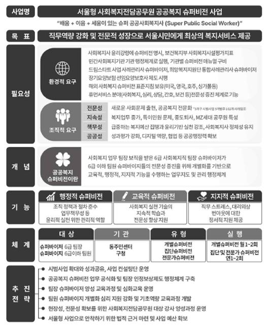 ‘공공복지 슈퍼비전’은 6급 복지팀장이 팀원에게 정기적인 행정·교육·지지적 지원을 제공하는 제도적 장치로, 2024년 1차 시범사업 당시 강남·강서·마포구 3개구를 대상으로 처음 도입되어 큰 호응을 얻었다.
