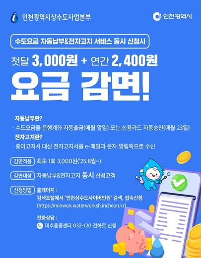 인천광역시 상수도사업본부는 시민들의 요금 납부 편의를 높이고 행정 효율성을 제고하기 위해 수도요금 전자고지 및 자동납부를 신청하는 시민에게 요금 감면 혜택을 제공한다고 밝혔다.
