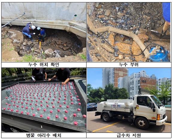 시는 단수로 인한 주민 불편을 최소화하기 위해 급수차 5대와 병물 아리수(2L) 약 7,200병을 긴급 지원했다. 이후 누수 복구를 마친 뒤 관 세척 및 수질검사를 실시했으며, 검사 결과 이상이 없는 것으로 확인됨에 따라 같은 날 19시 35분부터 정상 급수를 재개했다.