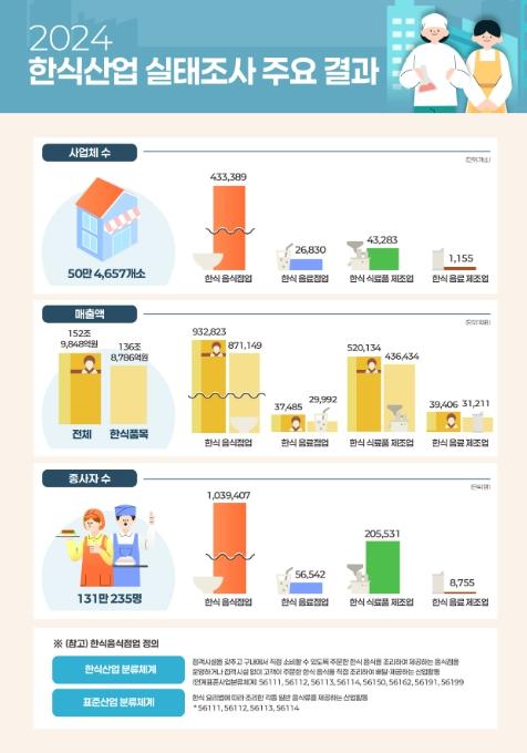 농림축산식품부와 한식진흥원은 2024년 한식산업 실태조사를 실시하고 그 결과를 발표했다. 2024년 한식산업 실태조사 결과, 한식 음식점 및 주점업의 사업체 수와 한식 메뉴 매출액이 지난해보다 각각 2.1%, 3.9% 감소했고, 한식 제조업의 사업체 수와 한식 제품 매출액은 각각 3.5%, 17.1% 증가했다.