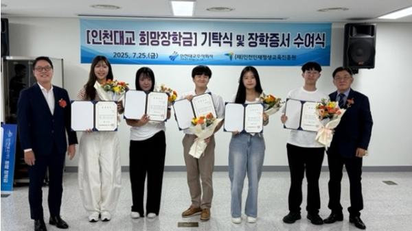 (재)인천인재평생교육진흥원과 인천대교(주)는 지난 25일 ‘2025년도 인천대교 희망 장학금 기탁식 및 장학증서 수여식’을 개최했다고 밝혔다.