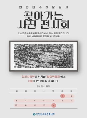 인천광역시 시립박물관은 8월 1일부터 8월 14일까지 인천지하철 1호선 인천시청역 내 ‘열린박물관’에서 대관전시 ‘인천민주화운동사 찾아가는 사진 전시회’를 개최한다고 밝혔다.