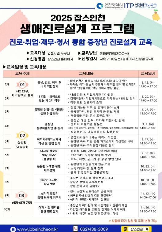 인천TP 관계자는 “평균수명 증가와 경력 변화가 반복되는 시대에 중장년층의 인생 2막 준비는 선택이 아닌 필수”라며, “진로·취업뿐 아니라 정서·경제·여가까지 삶 전반을 설계할 수 있도록 내용을 구성했다”라고 말했다.