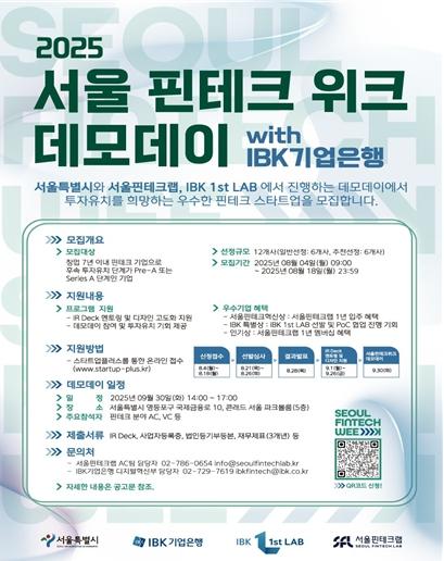 서울시는 글로벌 디지털금융 축제인 ‘서울핀테크위크 2025’의 핵심 프로그램 ‘데모데이 with IBK기업은행’에 참가할 혁신 AI・핀테크 스타트업을 8월 4일부터 18일까지 모집한다고 밝혔다.