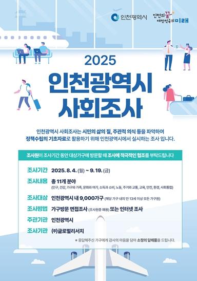 인천광역시는 오는 8월 4일부터 9월 19일까지 시민 삶의 질과 지역 사회 전반의 현황을 파악하기 위한 ‘2025년 인천사회지표조사’를 실시한다고 밝혔다.