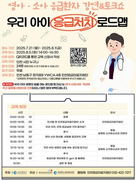 인천광역시는 8월 5일 시민들의 영·소아 응급상황 대응 능력 향상을 위해 전국 최초로 ‘영·소아 응급상황 대응 강연·토크쇼, 우리 아이 응급처치 로드맵’을 개최했다.