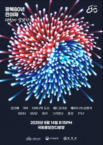 광복 80주년을 맞아 광복의 기쁨을 다시 한번 느껴볼 수 있는 ‘제80주년 광복절 전야제’가 오는 14일 국회의사당 잔디마당에서 개최된다.