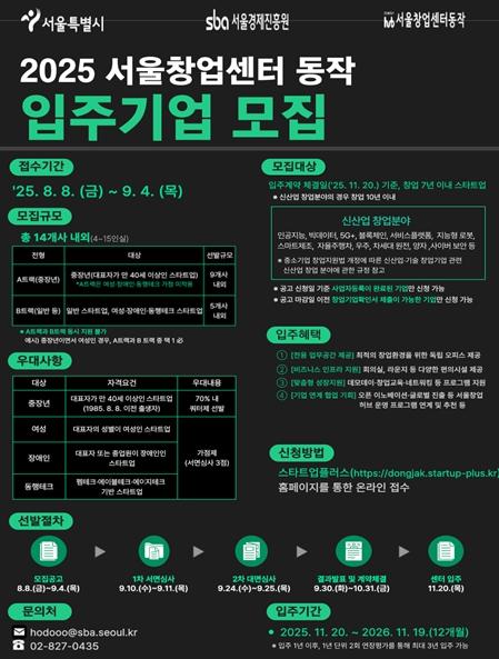 모집 관련 자세한 사항은 스타트업플러스 누리집에서 확인할 수 있으며, 관련 문의는 서울창업센터 동작을 통해 가능하다.