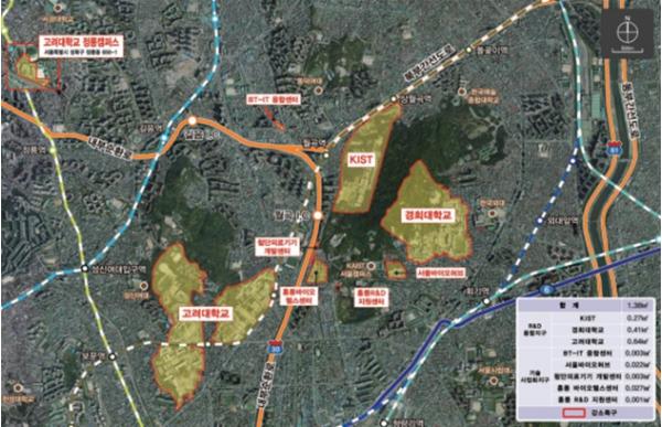 홍릉 강소연구개발특구는 서울 성북구 안암동・정릉동과 동대문구 회기동 일대 약 1.38㎢ 규모로 지난 2020년 8월에 지정・고시됐다. KIST, 경희대학교, 고려대학교 등의 기술 핵심 기관을 중심으로 배후 공간에 위치한 서울바이오허브, BT-IT융합센터 등이 바이오・의료 클러스터를 형성하고 있다.