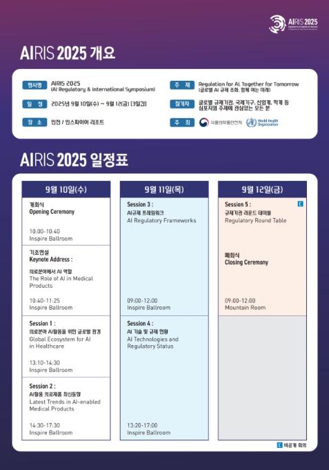 식품의약품안전처는 세계보건기구(WHO)와 ‘글로벌 AI 규제조화, 함께 여는 미래’라는 주제로 9월 10일부터 12일까지 3일간 인천 인스파이어 호텔에서 개최하는 '국제 인공지능 의료제품 규제 심포지엄(AIRIS 2025)'의 사전등록 신청을 8월 11일부터 22일까지 받는다고 밝혔다.