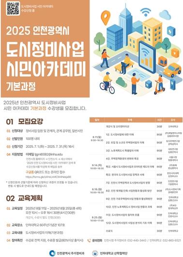 인천광역시는 8월 11일 인하대학교 60주년 기념관에서 ‘2025년 인천 도시정비사업 시민 아카데미 기본과정’ 개강식을 개최했다고 밝혔다.