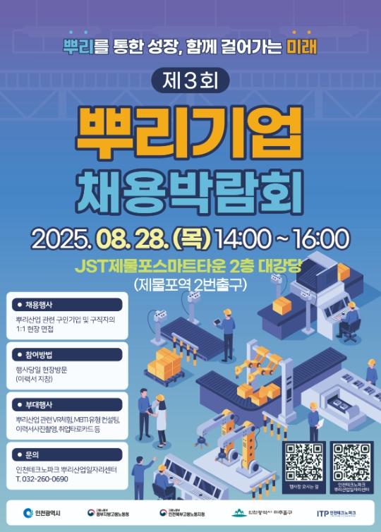 인천테크노파크(인천TP)와 인천시는 뿌리산업 인력난 해소와 지역 고용 활성화를 위해 오는 28일 제물포스마트타운 2층 대강당에서 ‘2025년 제3회 뿌리기업 채용박람회’를 개최한다.