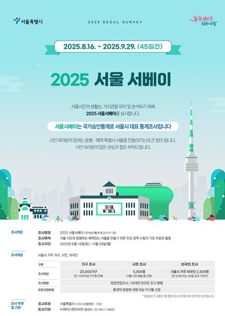 서울시는 오는 8월 16일부터 9월 29일까지 『2025 서울서베이』를 실시한다고 밝혔다.