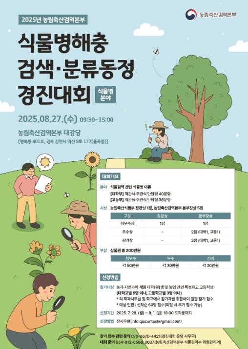 농림축산검역본부는 8월 27일 경상북도 김천 검역본부 대강당에서 ‘2025년 식물병해충 검색‧분류동정 경진대회’를 개최한다.