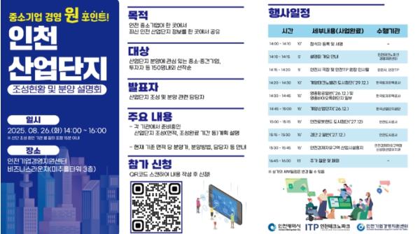 인천테크노파크(인천TP)는 8월 26일 송도 미추홀타워 3층에 있는 인천기업경영지원센터에서 ‘인천 산업단지 조성현황 및 분양 설명회’를 개최한다고 밝혔다.