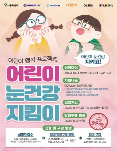 서울시는 「서울 어린이 행복 프로젝트」의 일환으로 디지털 기기 사용이 빨라진 어린이들의 눈 건강을 지원하는 ‘서울 어린이 눈건강 지킴이 사업’ 3차 신청·접수를 오는 8월 19일부터 일주일간 진행한다.